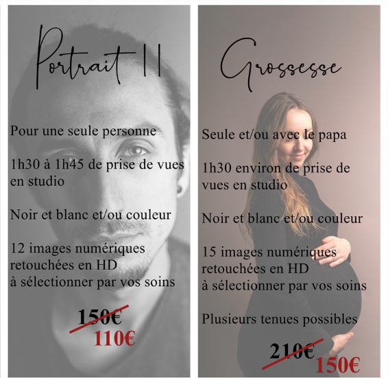 Venez prendre un boost de confiance en vous avec une séance Portrait ou offrez un souvenir intemporel à une maman en devenir grùce aux promotions suivantes :